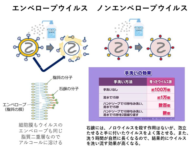 これには、ウイルス粒子の表面を作っている成分にアルコールで溶ける脂質が含まれているかいないかで決まります。