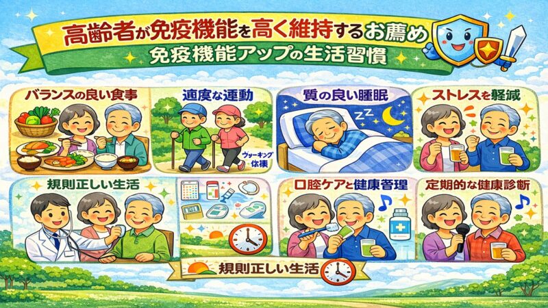高齢者が免疫機能を高く維持するためには、運動・栄養・睡眠・社会的つながりに加え、口腔ケアやストレス管理、定期的な健康チェックを意識した生活が重要である。