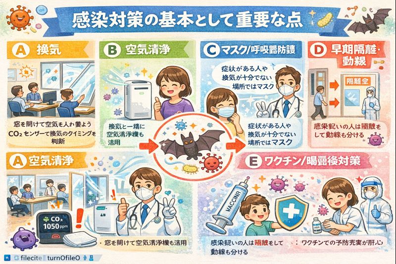 - 換気やフィルター等の空気清浄は単独ではリスクをゼロにできないが、他の対策と組み合わせる重要要素(換気+マスク等とセット)。