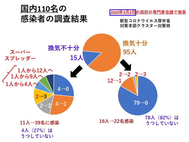これは、当時、このデータに大変興味をもち、その資料の中の数字をもとにこのスライドを作成し、セミナーでしばしば使った記憶があります。しかし、なぜか、その時の厚生労働省クラスター対策班の資料が探せなくなりました。